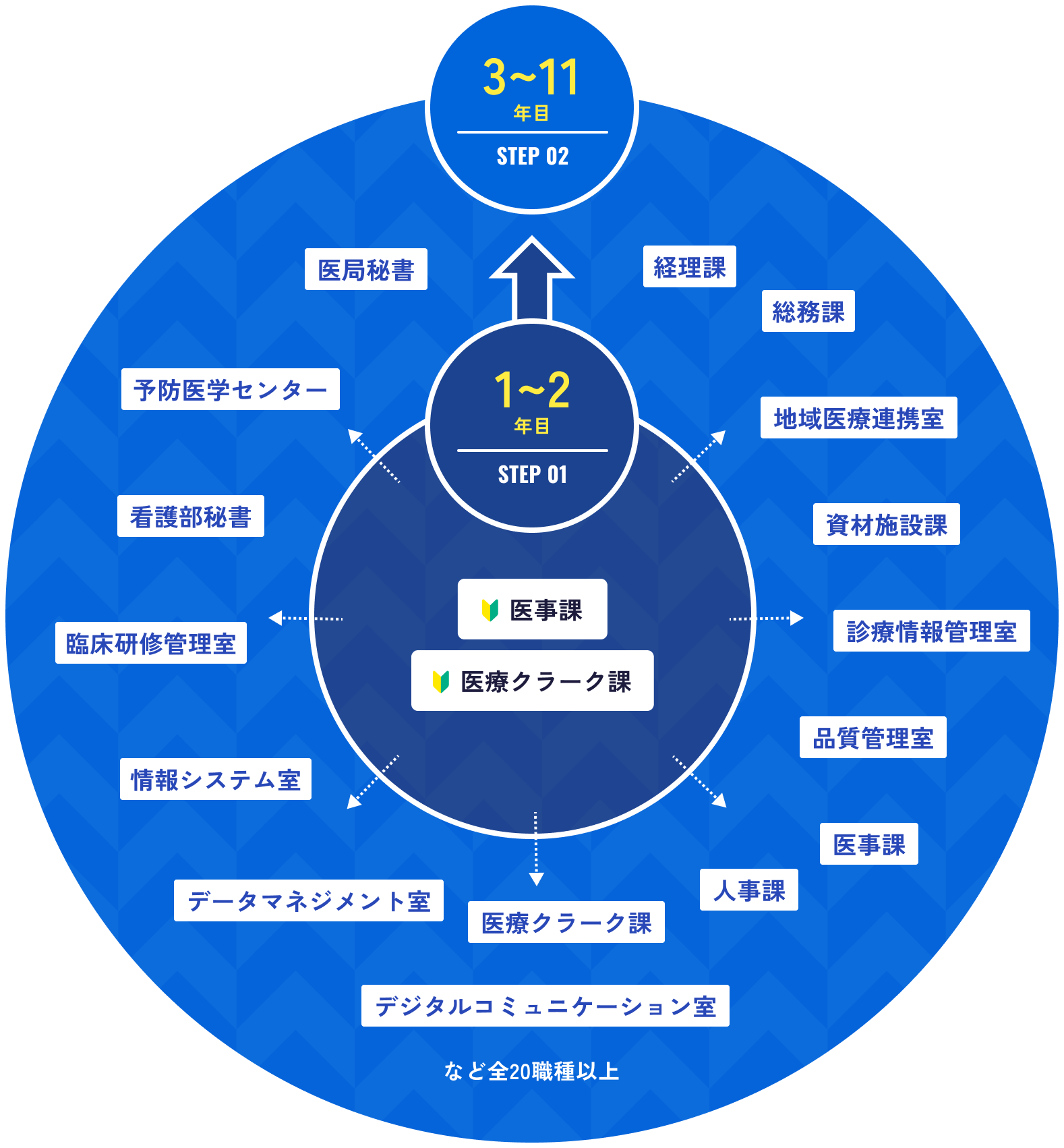 これまで、医事課と医療クラーク課に計4年間、配属されるのが通常でしたが、この2職種の経験を計2年間に凝縮。病院の運営推進にいち早く近づけるコースです。